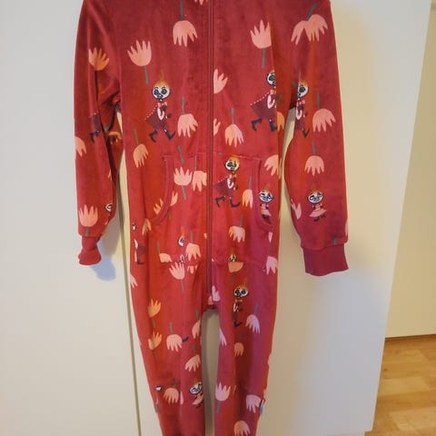 Moitteeton vaaleanpunainen Moomin haalari koossa 98. Haalarissa on kirsikka-aiheinen kuosi.
