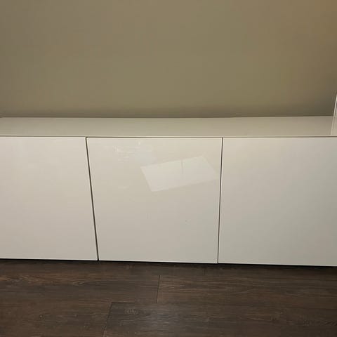 Ikea Bestå tv-taso ja yläkaapit kiiltävän valkoisilla ovilla