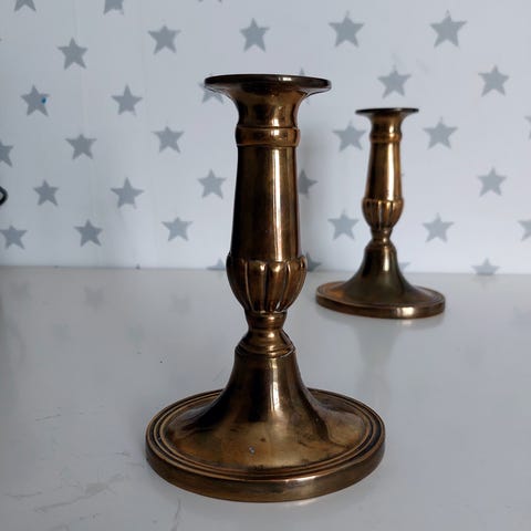 Hyvässä kunnossa olevat kullanväriset kynttilänjalat. Vähäisiä käytönjälkiä. Kruunukynttilöille sopivat.