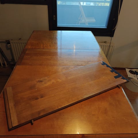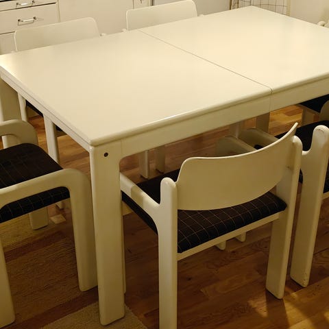 Eli pöytä ja tuolit eivät ole enää uusia, mutta ovat hyvässä vintage kunnossa