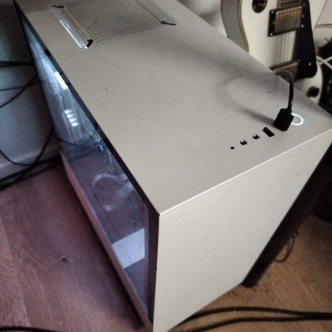 Lasinen sivupaneeli pysyy tukevasti paikallaan, mutta kotelon ruuvikierteissä on kulumaa ja yksi ruuvi on katkennut kotelon sisään. Ei vaikuta käyttöön tai toimintaan.
