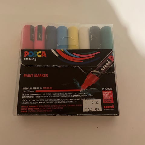 Posca Fineliner tussit sisältävät 8 eri väriä ja niissä on 0,9-1,3 mm paksuinen kärki. Vaaleansininen vain testattu, muuten käyttämättömiä.