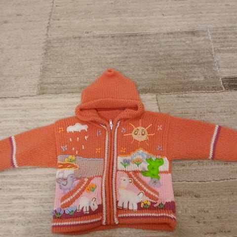 Käsin neulottu mekko tyttöle 6 - 18 kuukautta. 51% akrylli, 49% villa, persikkavärinen.