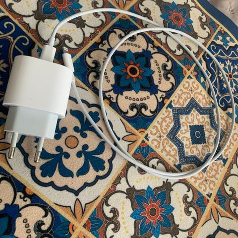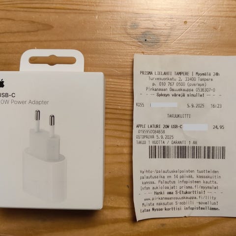 Apple laturi, valkoinen väri, tarkoitettu Apple-laitteiden lataukseen.