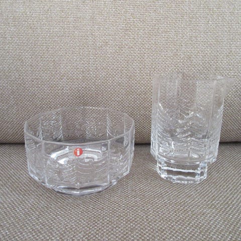 Iittala Kuusi-sarjan kermakko on kirkasta lasia, jossa on kohokuvioitu kuusimetsäkuviointi. Jorma Vennolan Iittalalle suunnitteleman Kuusi-sarjan kermakko. Sarja oli tuotannossa v. 1980-92. Kermakon korkeus on 100 mm, halkaisija 65 mm ja tilavuus 23 cl. Erittäin hyvässä kunnossa. Hinta 25 euroa. Voin lähettää. Mmm.