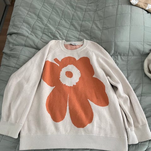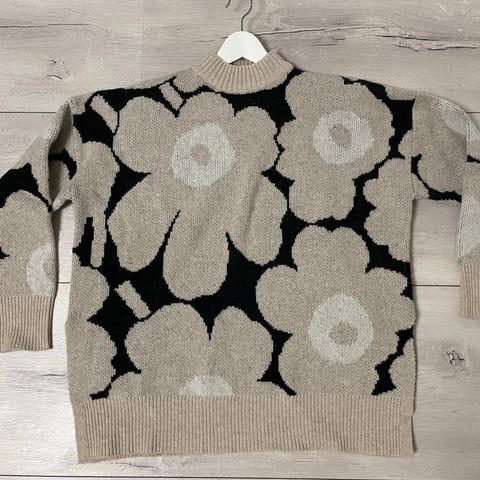 Marimekko Onnekas Unikko neule beige väri, koko M, valmistettu villasta. Kai-kai 63, hiha 46, pituus 68. Sivuilla halkiot. Vain härmä pintanyppyä, muuten lähes uudenveroinen, hyvä käytetty kunto. Vain tuuletettu, ei pesulla pilattu. Lämmin neule talveksi.