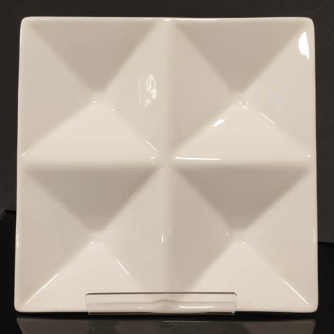 Siinä on geometrinen muotoilu, joka jakaa tarjoiluastian neljään erilliseen lokeroon.