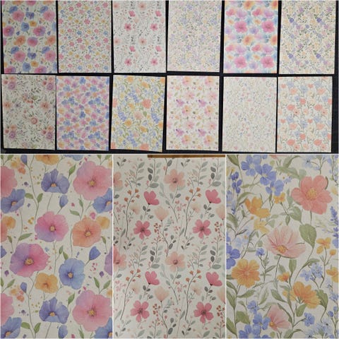 12 kpl uusia pastellin sävyisiä kuin vesivärillä tehtyjä mattapintaisia papereita kukka kuvioilla skräppäykseen askarteluun korttien tekoon tai vaikkapa kehyksiin niin saa todella kauniit taulut sisustukseen!
