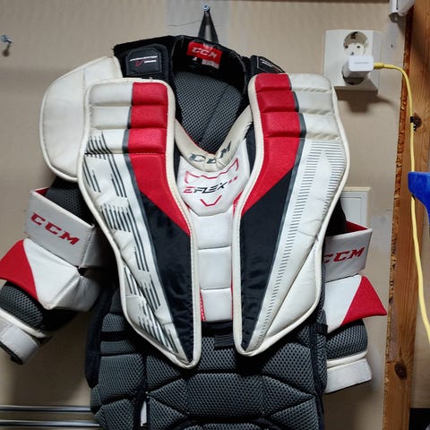 CCM YT jääkiekon maalivahdin rintapanssari, koko L-XL. Suunniteltu jääkiekon pelaamiseen ja suojaamaan ylävartaloa pelitilanteissa.