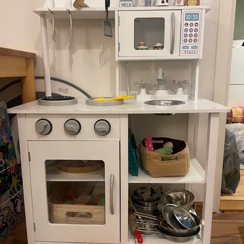 Siisti leikkikeittiö seuraavalle. Mukaan sekalainen kassi keittiötarvikkeita mm. paistinpannu, kattila ym. sekä leikkiruokia. Toisen keittolevyn valo ei toimi, patterit juuri vaihdettu.