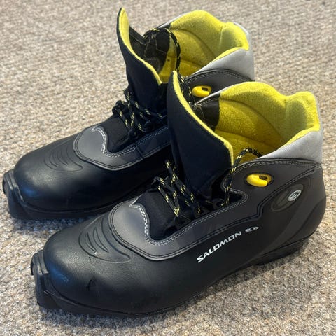 Salomon hiihtomono, koko 39 1/3, harmaa väri. Sisältää vetoketjullisen suojuksen ja pehmustetun sisävuoren. Käytetty kunto, sopii maastohiihtoon.