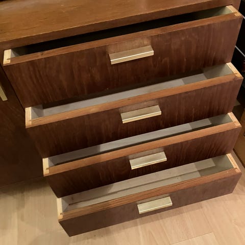 Senkin tasosta on poistettu vanha huonokuntoinen lakkapinta ja se on lakattu uudelleen himmeällä venelakalla. Muut osat senkistä on puhdistettu hyvin ja öljytty restaurointiöljyllä. Takalevy (musta), hyllynlevy (musta) ja hyllynkannakkeet on uusittu kokonaan. Senkissä ollut sokkeli on korvattu käytännöllisemmillä, tukevilla metallijaloilla, jotka ovat myös 60-70-luvulta. Laatikot ovat sisäpuolelta siistit.