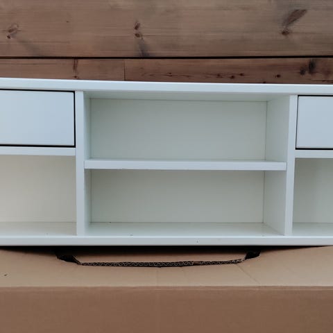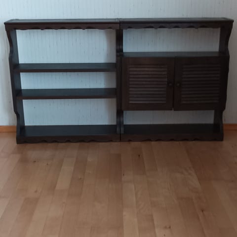 Kaksi sievää seinähyllyä, luonnonvalkoiset. Toisessa kolme oksankohtaa tullut läpi