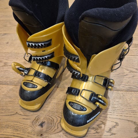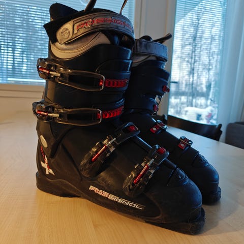 Rossignol laskettelumonot, koko 275 mm, musta väri. Valmistettu Romaniassa. Monot soveltuvat lasketteluun ja niissä on neljä solkea jalkaterän tukemiseksi.