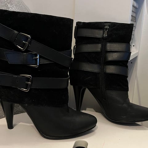 Harmaat vetoketjulliset saappaat mokannäköistä tekstiiliä.
