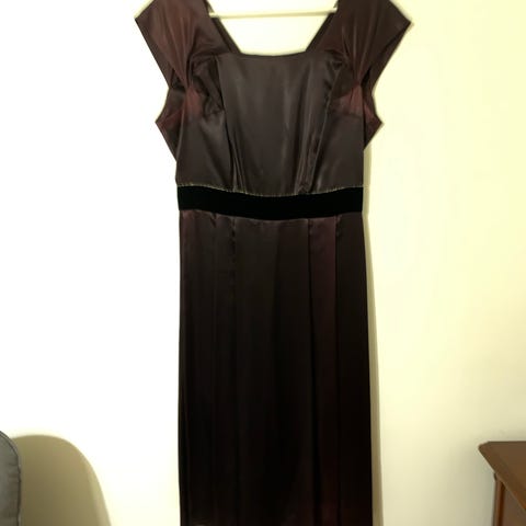 Myydään aito Vintage leninki koko 40 (42) Ollut hääpuku äidilläni maistraatissa vuonna 1970. Mekko on vuoritettu, siinä on toimiva vetskari. Se on puhdas ja hajuton. Ikäisekseen hienossa kunnossa. Toisessa kyynärpäässä on pieni rikki kankaassa jota ei huomaa tumman värin ja vuorin johdosta.