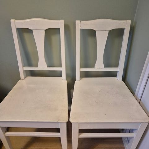 15e/kpl. Kaksi vanhaa, kaunista tuolia. Pohjan merkintöjen mukaan 1800-luvulta. Maalattu valkoisiksi, mutta maali kaipaisi kunnostusta. Tukevat istua.