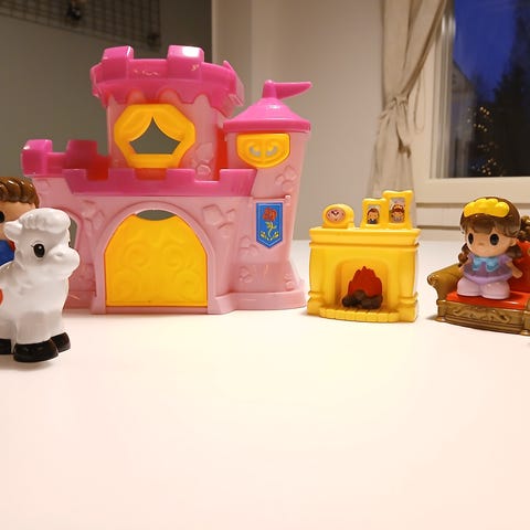 Kun ovikellosta painaa kuuluu äänet ja torneihin syttyy valot. Muutamia hahmoja ja prinsessasänky mukana, saattaa löytyä lisääkin. Muutamia kuluneita tarrajälkiä.