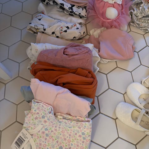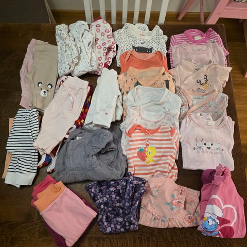 Tyttövauvalle vaatepaketti koossa 50-56. Ehjiä ja tahrattomia. Pientä pesunukkaa mutta ei kyllä pistä silmään. Paketti sisältää: