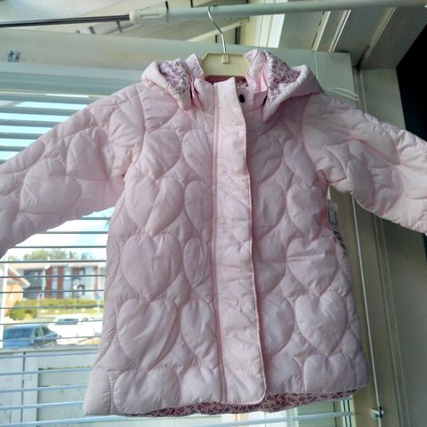 Tummansininen, kevyesti topattu takki koossa 86. Irrotettava huppu ja edessä nepparikiinnitys.