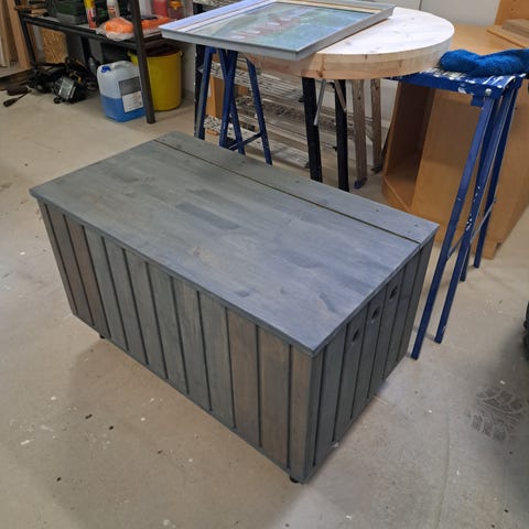 Myydään tarpeettomana katetullaterassilla ollut itsetehty säilytyslaatikko.