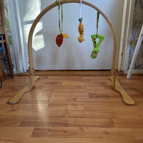 Lasten lelu, värikäs kiinnitettävä leikkikaari, jossa erilaisia roikkuvia leluja. Leikkikaari on valmistettu pehmeästä materiaalista ja sen voi kiinnittää esimerkiksi rattaisiin tai turvakaukaloon. Sopii lapsille leikkimiseen ja aistien kehittämiseen.