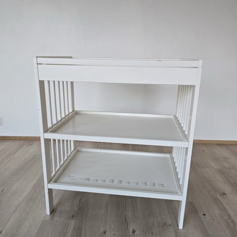 IKEA lastenhoitopöytä valkoinen. Käytössä ollut, näkyvissä kulumaa ja käytön jälkiä, yleisilmeeltään siisti.