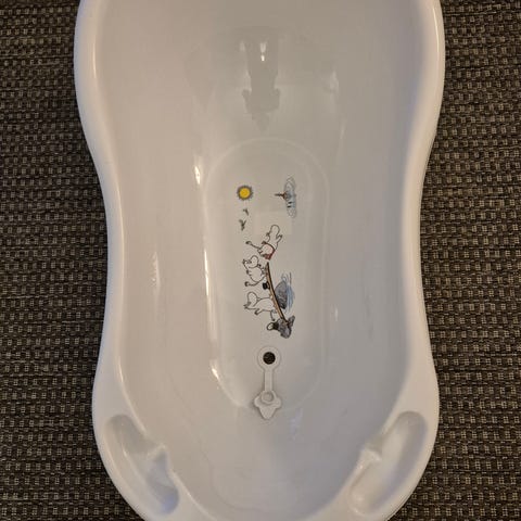 Muumi amme / vanna ja erillinen imukupeilla kiinnittyvä vauvatuki. Ammeen tyhjennys onnistuu kätevästi pohjassa olevan tulpan kautta.
