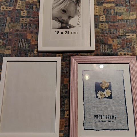 Kaksi valokuvakehystä. Näihin mahtuu 13x18cm ja 13x9cm kuvat, kehykset saa sekä vaakaan, että pystyyn. Voi ripustaa seinälle tai laittaa pöydälle. Nouto Tampereen Raholasta tai lähetyskulut ostajalle.