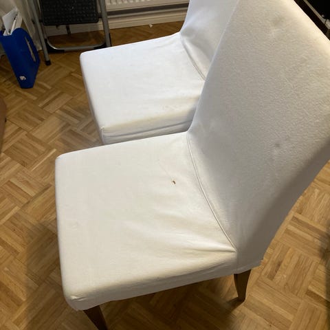 Kaksi ikean tuolia, likaa päällisissä ja toinen tuoleista keikkuu. En ole yrittänyt pestä tai korjata, uskoisin että lähtee tekstiilipesurilla. Saumakohdissa myös rispaumaa.