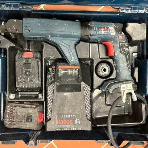 Bosch Professional 18V väliseinä ruuvinväännin GSR 18V EC TE sekä lisäpalikkana MA55 ruuvilipas. Mukana kaksi 4 Ah akkua, laturi ja salkku. Toinen akuista latautuu täysiin palkkeihin, toinen 4/5.