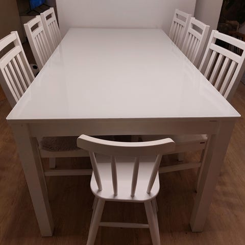 Myydään iso täyspuinen ruokapöytä, öljyttyä tammea, lasikannella. HUOM! Tuolit ei myynnissä.