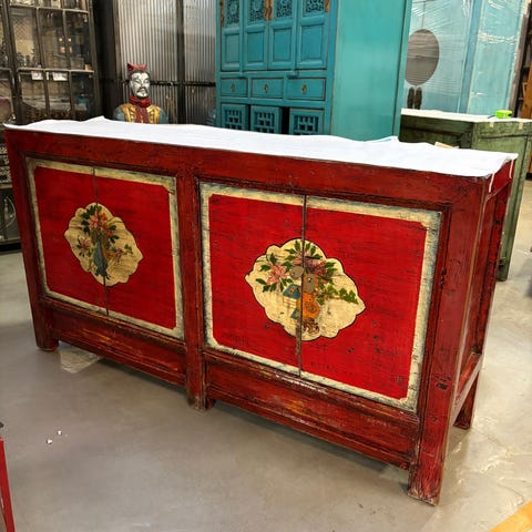 Aasialais-tyylinen puinen senkki neljällä ovella. Senkki on mänty puuta. Senkki on vihreän värinen ja ovissa kauniit ja koristeelliset maalaukset.