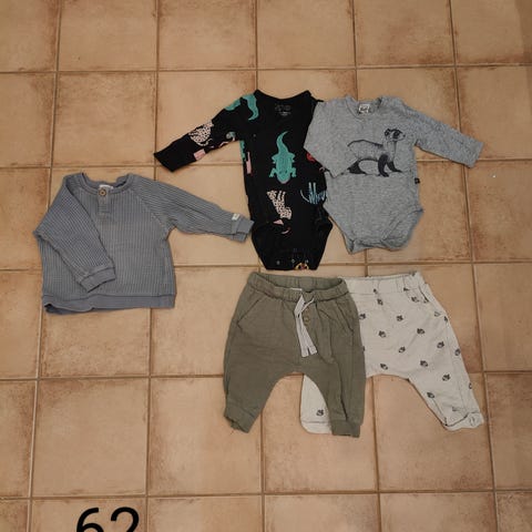 Kaikki vaatteet kokoa 62. Mukana kaksi Lindexin bodya, valkoisessa pienen pienet pistetahrat yhden raidan vieressä. Muuten molemmissa siisti ja hyvä kunto. Popin collegehaalari, farkun näköistä kangasta. Haalarissa myös siisti ja hyvä kunto.