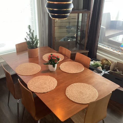 Ruokailuryhmä. Tuoleja 6kpl. Yksi tuoleista liimattu, ei estä käyttöä. Merkkinä Stemma. Hyvässä kunnossa, käytönjälkiä. Nouto Espoon Leppävaarasta.