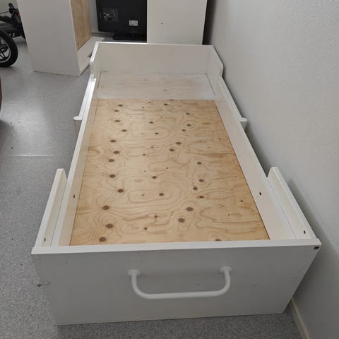 Varavuoteen alla nostojalat/pyörät, mutta varavuodetta voi käyttää myös säilytyslaatikkona. Sängyssä yksi iso ja kaksi pientä, hyvässä kunnossa olevaa pehmustetta. Patjan koko 200x80. Halutessaan mukaan saa myös sängyssä olleen Ikean patjan ja Askosta ostetun petauspatjan.