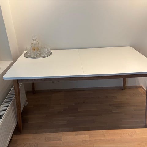 Vankka liimapuukantinen ruokapöytä ensimmäisen omistajan kodista. Kolhuton ja puhdas mutta ei uusi, vaan normaaliin tapaan käytetty: vähäistä käyttökulumaa siis löytyy, mutta ei mitään silmiinpistävää. Kannen alla piilossa jatkopala, sen avulla kuuden hengen pöydästä kehkeytyy kahdeksan hengen pöytä. Siisti ja käyttövalmis kokonaisuus. Soikean muotoinen kansi ilman jatkopalaa 150 x 95 cm, jatkopalalla 195 x 95 cm. Pöydän korkeus 73 cm, vapaa polvitila kannen alla 63 cm. Kunnon puusta tehty pöytä painaa n. 25 kg. Kotiinkuljetus järjestyy samaan hintaan Tampereella ja naapurikunnissa, kauemmaksikin polttoainekuluja vastaan. Kysy!