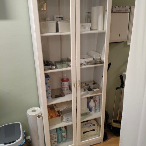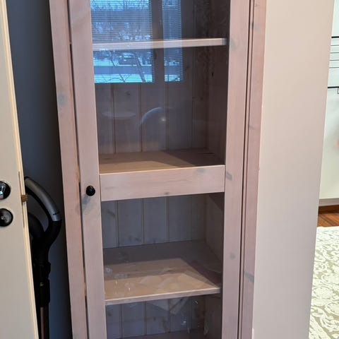 Myydään Ikea Stockholm vitriinikaappi. Vitriinikaapissa on lasiset hyllyt.