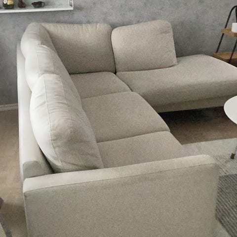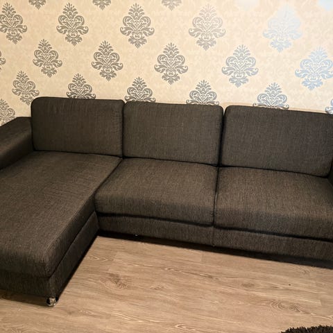 Kulmasohva. Kuvanmukainen koko 240cm/300cm/150cm + rahi 85x64cm. Istumakorkeus 48. Ehjä mutta pesua kaipaa. Kulumaa löytyy pinnasta.