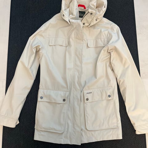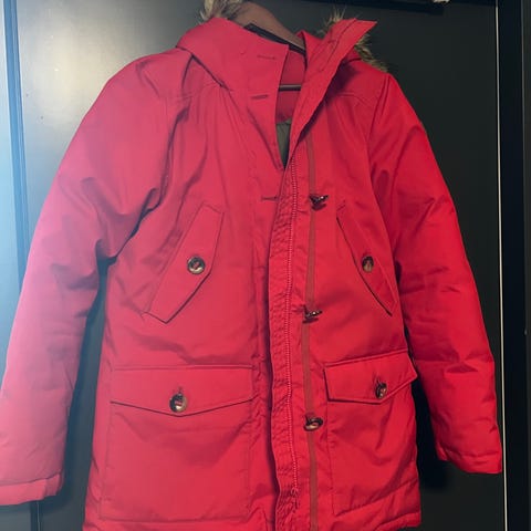 Olen itse lisännyt takin hupun reunukseen aidon turkiksen, jonka saa irti napeilla. Myyn takkia ilman turkisreunusta hintaan 80 € tai turkiksella 95 €.