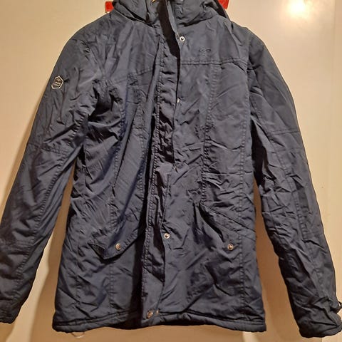 Uudenveroinen, tummansininen takki, jossa ohut vuori. Hupun reunassa pienenpieni tahra (kuva).