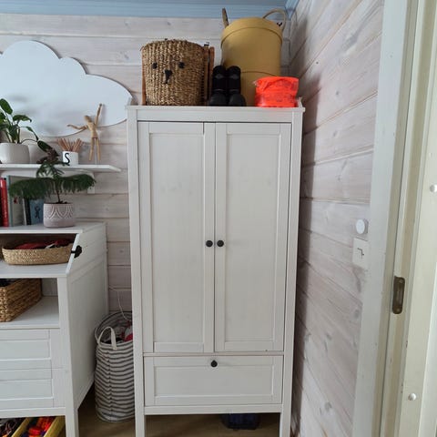 IKEA BUSUNGE vaatekaappi valkoisena, mitoiltaan 80x139 cm. Kaapissa on kaksi ovea, sisällä hyllytila ja kaksi vetolaatikkoa. Materiaali on puuta ja se soveltuu lastenhuoneeseen vaatteiden säilytykseen.