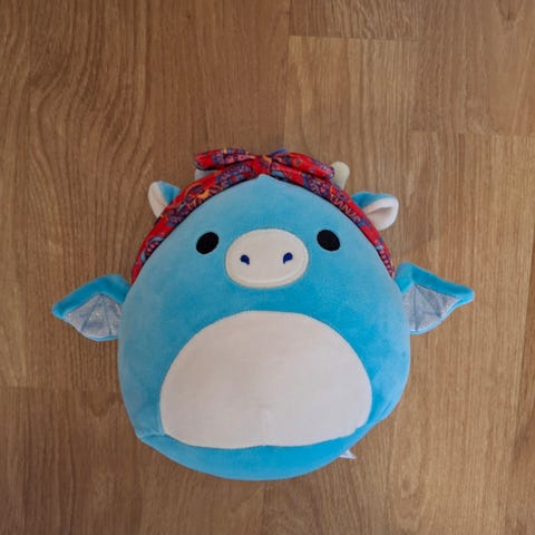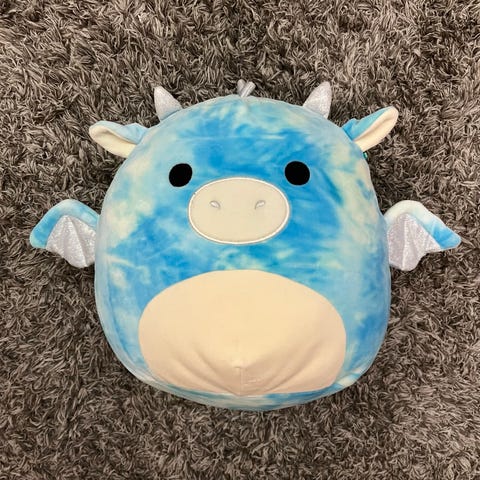 Squishmallows pehmolelu, lohikäärmemalli. Pehmeä materiaali ja vaaleanvihreä väri.