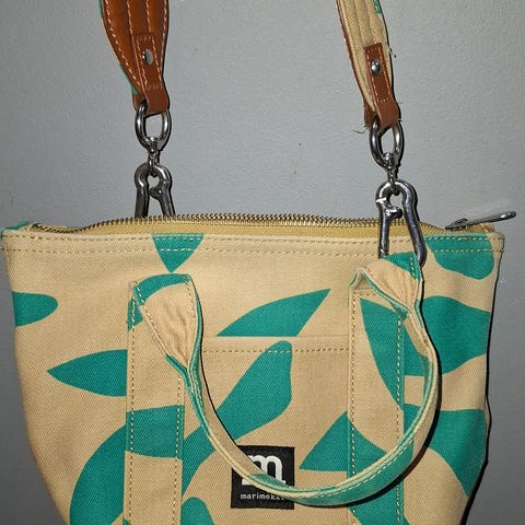 Harvinainen Virva Launon Marimekolle suunnittelema tilava tote-laukku.Ajaton ja laadukas design,joka sopii niin arkeen kuin reissuun.Laukku on hyväkuntoinen.Matetiaalina kestävä puuvillamarkiisi, jota pirteät punaiset kiiltonahkatehosteet kauniisti koristavat. Todellinen katseenvangitsija ja keräilyharvinaisuus!
