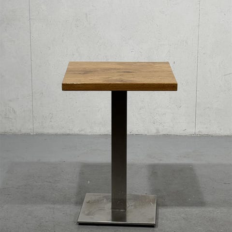 Neliönmuotoinen kahvilapöytä, jossa on pun värinen laminoitu, helppohoitoinen pöytälevy ja metallinen tukeva jalka, jonka alla säätöruuvit. Pöydän koko on 55x55 cm ja korkeus 95 cm.