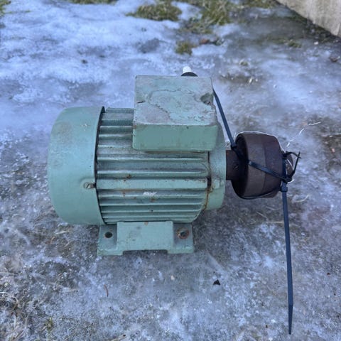 Sähkömoottori 1200w. 220v, 5,7A. Pyörimisnopeus 1400rpm. Tuuletinsiipi rautaa. Kartioakseli 17,5mm-20mm. Akselille holkki, mikä tarvitsee työstöä ollakseen suora 28,5mm. Nouto.
