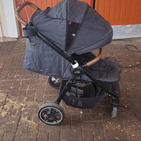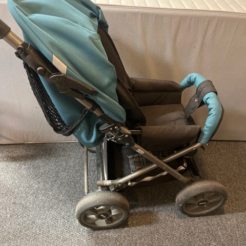 Hyvin liikkuvat ja helposti työnnettävät Brio-lastenvaunut (tarkempi malli ei tiedossa). Vaunujen yläosan saa irti, joten ne mahtuvat pienempään tilaan kuljetuksen ajaksi. Mukaan tulee vielä sisäosan pehmusteet. Lastenvaunut saa hakea 42 eurolla.