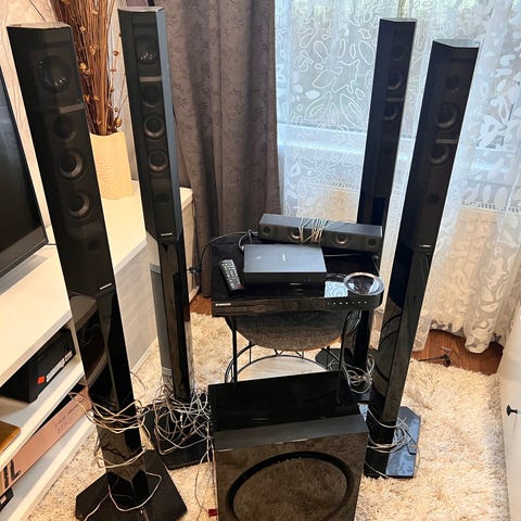 Samsung kotiteatterijärjestelmä 3 jalkakaiutintia ja yksi keskikaiutin sekä subwooferi ja DVD soitin.