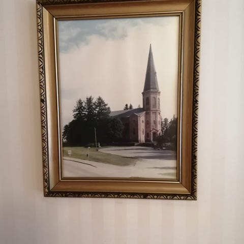 Enon kirkosta puukehyksillä kehystetty valokuvataulu . Korkeus 37 cm leveys 52 cm.