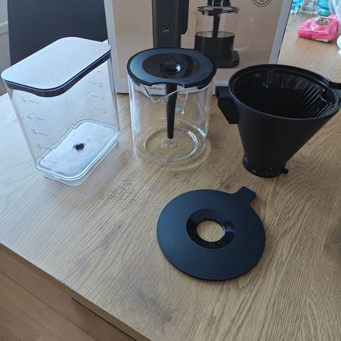 Wilfa Svart Aroma kahvinkeitin, jossa musta runko ja lasinen kahvikannu. Tuote myydään siinä kunnossa kuin on. Kuitenkin toimii.
